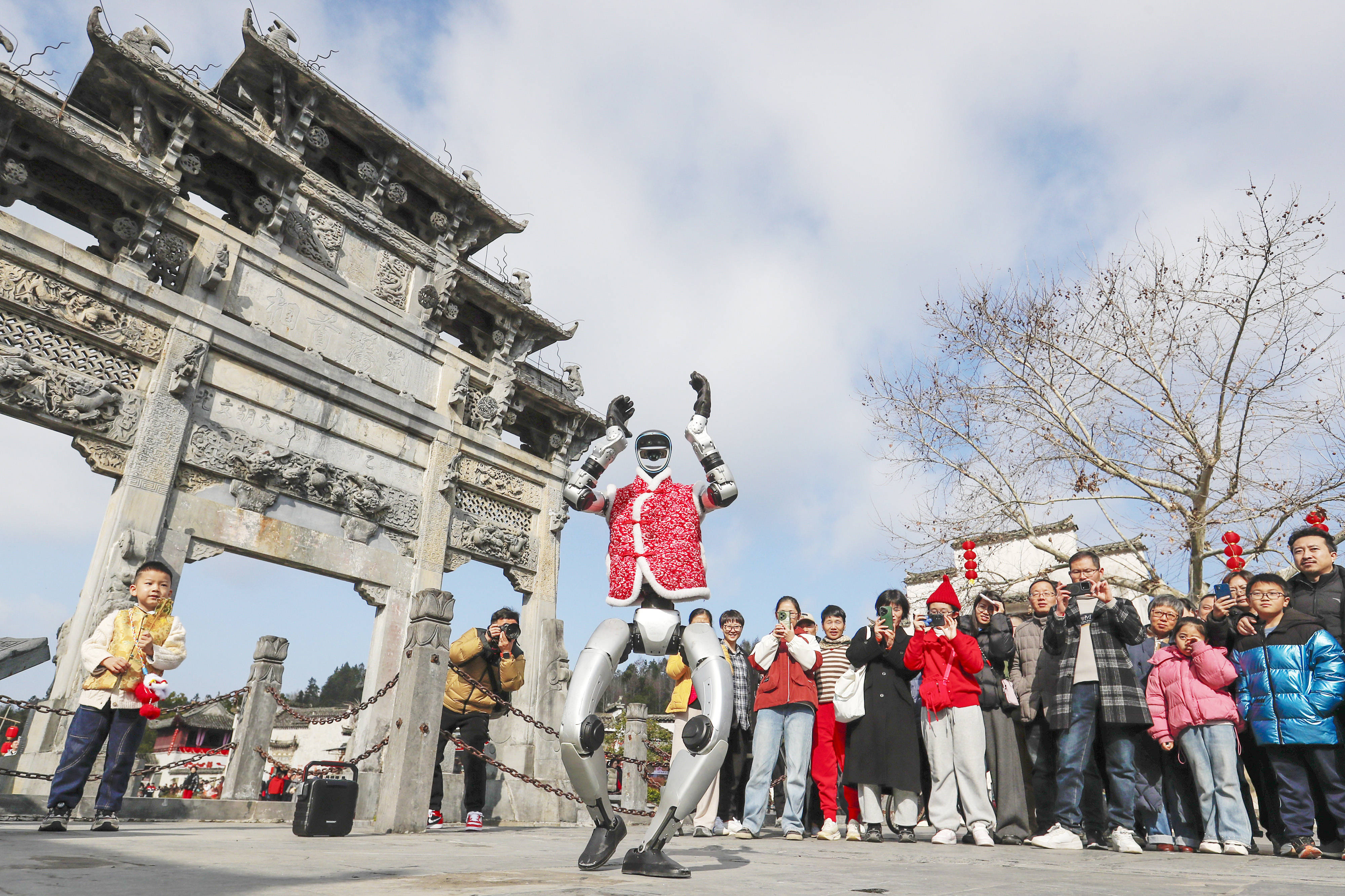 2月18日,游客在安徽省黟县西递古村观看机器人表演。新华社发(施亚磊摄)