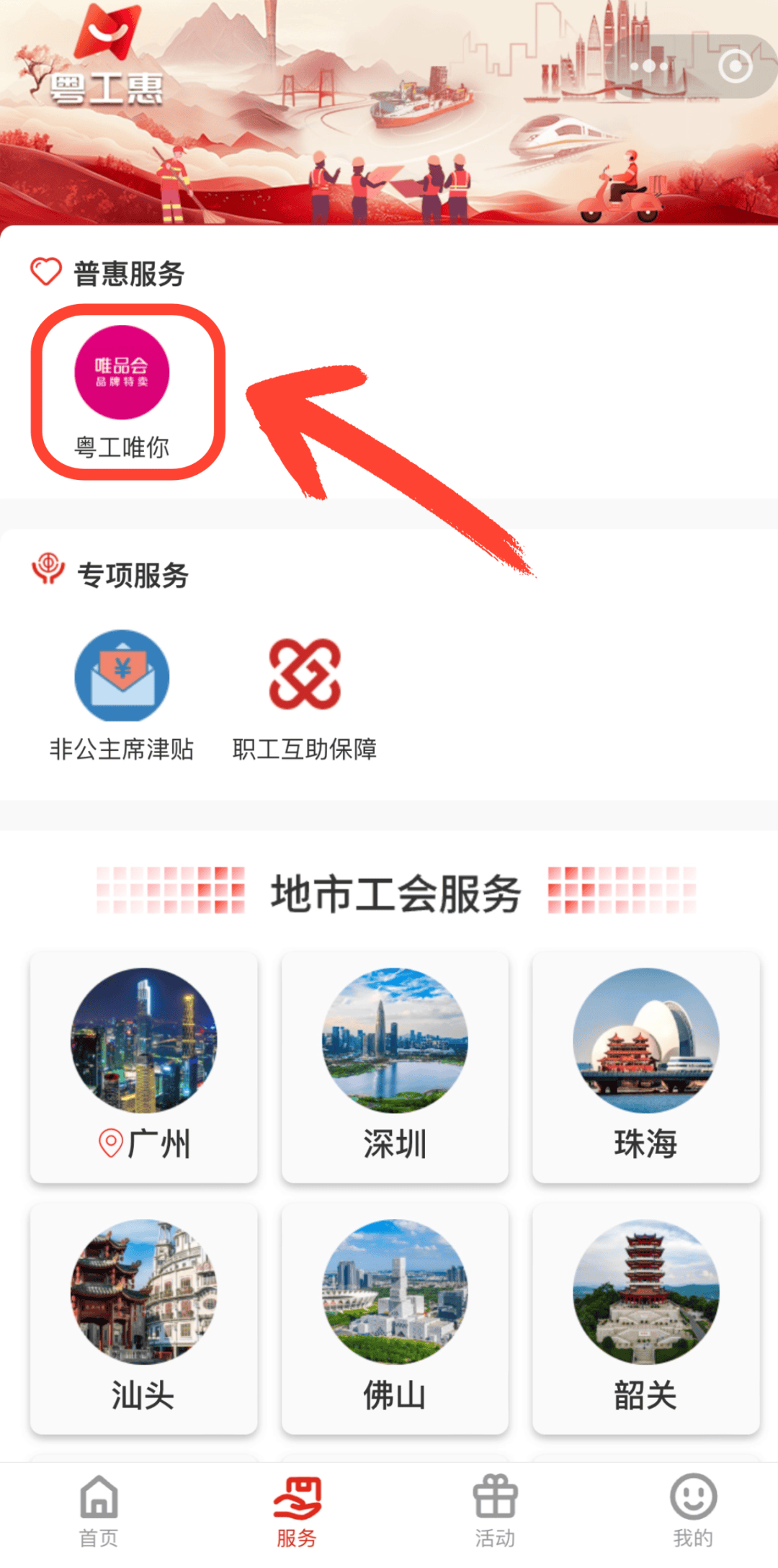 用户中奖后,登录“粤工惠”小程序,依次点击 “服务” - “粤工唯你” 跳转至“唯品会专区”并授权登录(如下图),优惠券即可直充到账。