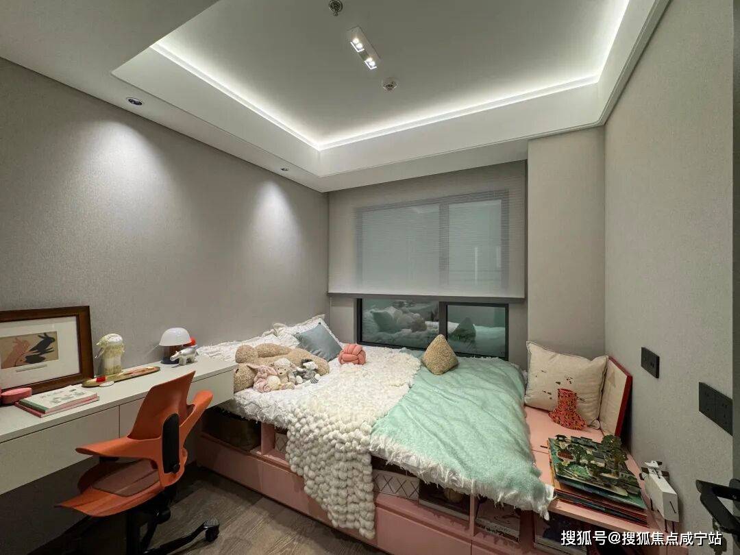 国誉府这个98㎡是飞机户型,本身比动静分离的三房空间利用率要高一些,加上又是纯洋房,天然的高得房率,因此这个主卧尺度感非常好,比一般户型主卧更大、更方正,主卧床头背景墙也是交付标准。