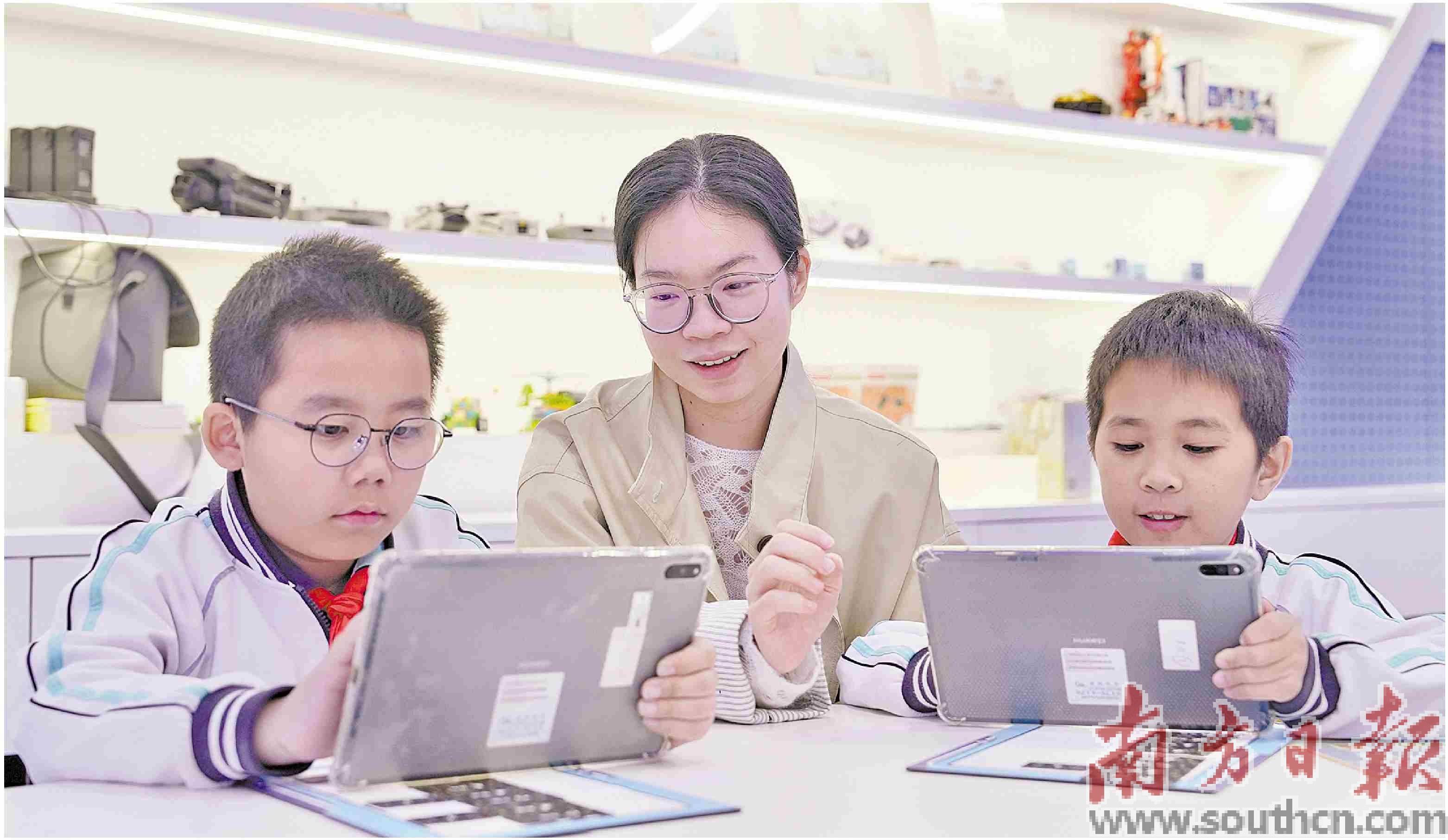 松湖三小联合华为打造阶梯式鸿蒙课程体系。图为老师对学生开展编程教学。麦晴怡 摄