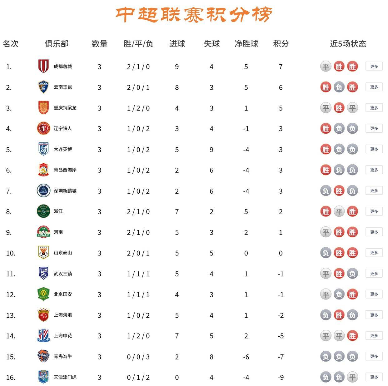 新赛季中超风风火火开局三轮连战,随后联赛将进入一个间歇期。三轮战罢,联赛出现全新格局,排名前三的球队除了蓉城是个老面孔,排名第二的玉昆和排名第三的重庆铜梁龙全都是联赛三强新面孔。而曾经联赛积分榜前五的常客上海申花,北京国安,上海海港和山东泰山全都排名十名开外,成为新一代降级区管理员。和他们这个排名对应的是,负分开局的球队里,九支球队只有三支球队完成清零,还有六支球队带着负分进入见习期。