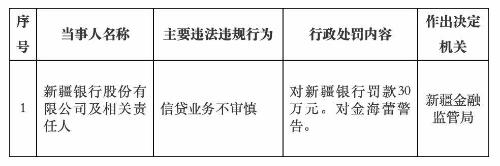 4月13日,新疆金融监管局披露一则行政处罚信息,因信贷业务不审慎,新疆银行被罚款30万元。同时,相关责任人金海蕾被警告。