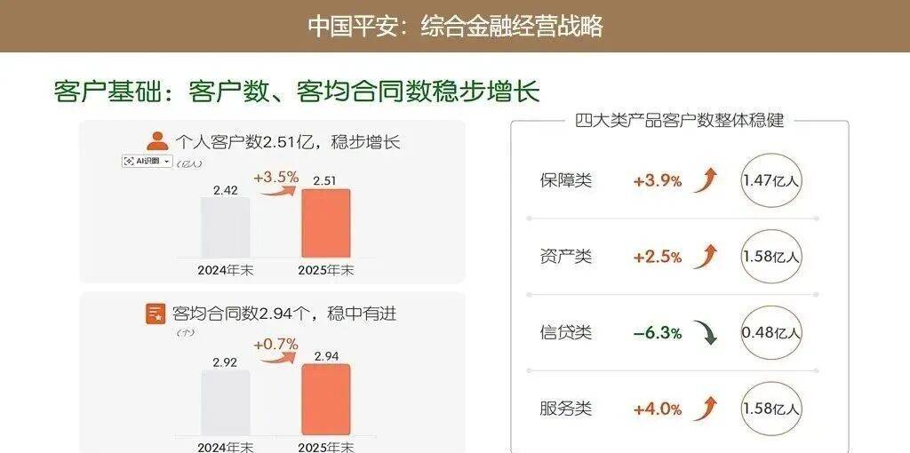 数据显示也印证了这一点。截至2025年末,平安客户价值客户较年初增长6%,内部获客成本相比外部获客成本平均节省35-45%,衡量综合金融的“三数”——客户数、客均合同数和客均产品数依旧稳健增长。