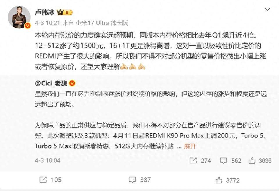 2026年4月,小米集团总裁卢伟冰在社交媒体上表态,“本轮内存涨价的力度确实远超预期,同版本内存价格相比去年一季度飙升近4倍。12+512涨了约1500元,16+1T更是涨得离谱,这对一直以极致性价比定价的REDMI产生了很大的影响。所以我们不得不对部分机型的零售价格做出小幅上涨或者恢复原价,还望大家理解。”他进一步表示,本次存储涨价影响面非常大,不仅影响了手机,其实影响了整个消费电子,行业里所有的玩家无一幸免。