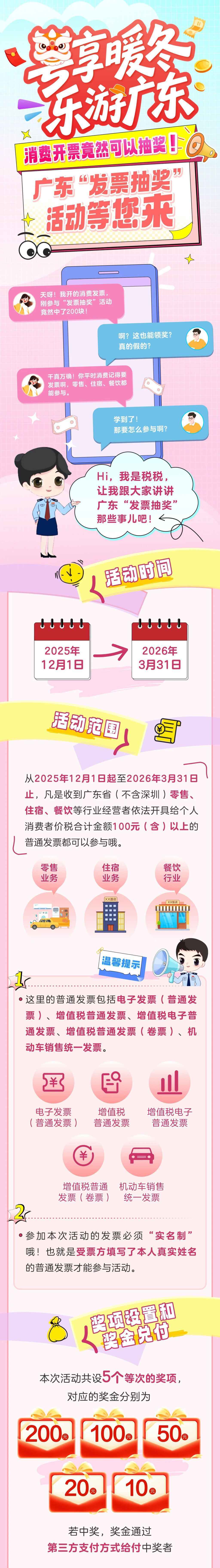 记者获悉,国家税务总局广东省税务局联合广东省商务厅和广东省财政厅于2025年12月1日至2026年3月31日在广东省范围内(不含深圳市)开展“粤享暖冬 乐游广东”发票抽奖活动。