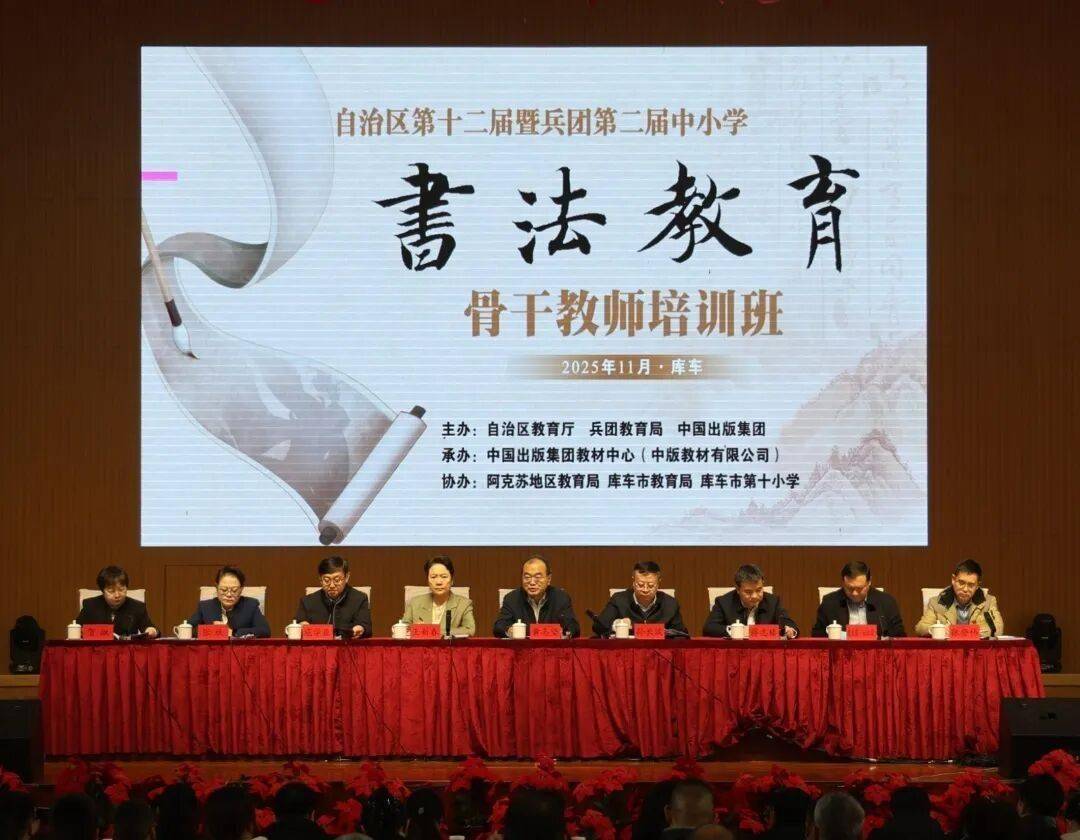 11月11日上午,培训班开班式在库车市第十小学举行。中国出版集团有限公司董事长、党组书记黄志坚;新疆维吾尔自治区人民政府总督学、教育厅党组成员孙长波;阿克苏地区行署副专员,地委教育工委副书记王新春;中版教材有限公司总经理兼现代教育出版社副总经理蒋志臻;河北师大书法研究所所长、教授寇学臣;库车市委副书记、市长麦麦提·吐拉甫等出席活动。