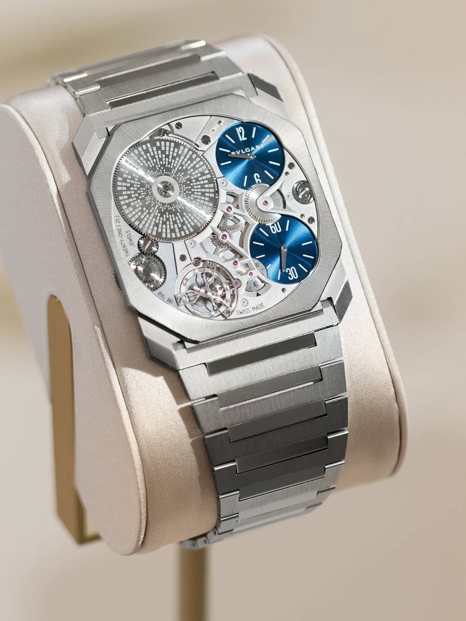 如果说珠宝是色彩的颂歌,那么宝格丽高级腕表则是形态的建筑诗。宝格丽Octo Finissimo Ultra铂金腕表,以其仅1.80毫米的整表厚度,再次挑战了物理极限。这枚限量20枚的杰作,其价值不仅在于纤薄,更在于它以坚固的铂金和碳化钨,实现了坚固与轻盈的矛盾统一。而另一枚厚度仅5.80毫米的宝格丽Octo Finissimo万年历腕表,则在18K玫瑰金的温润质感下,蕴藏了品牌在复杂功能微型化领域的深厚造诣。