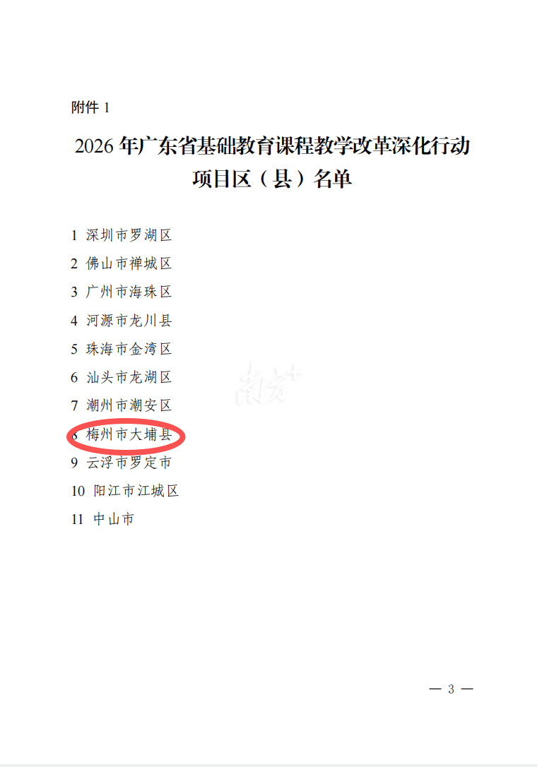 记者获悉,近期《广东省教育厅关于公布2026年基础教育课程教学改革深化行动项目区(县)、项目校名单的通知》下发,梅州市大埔县被立项为“2026 年广东省基础教育课程教学改革深化行动项目区(县)”,为全省10个项目区(县)之一;五华县华新中学、梅州市梅江区梅州中学、大埔县城东实验学校、丰顺县实验小学、五华县黄狮小学、五华县安流中学6所学校被立项为“2026年广东省基础教育课程教学改革深化行动项目校”,超过全省平均立项比例。