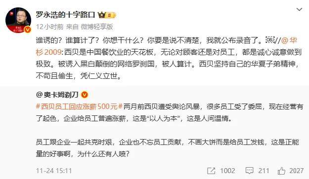 此前,在罗永浩与西贝的预制菜之争中,西贝背后的营销咨询公司“华与华”也被卷入其中。其创始人华杉发文力挺西贝创始人贾国龙,并将罗永浩描述为“网络黑嘴”,舆论风波再度升级。