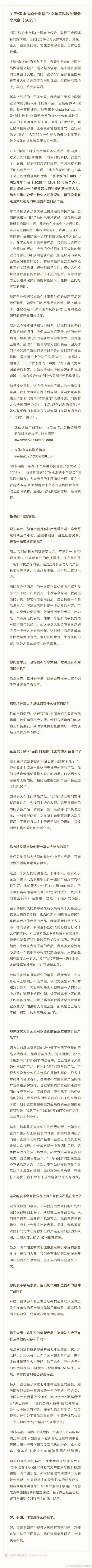 12月1日,罗永浩发长文宣布,“罗永浩的十字路口”之年度科技创新分享大会(2025)将于今年12月30日在上海召开。在长文中,罗永浩解答了一些相关问题。他表示,科技创新分享大会不是“带货直播”,大会上将发布细红线科技内部开发的AI软件。