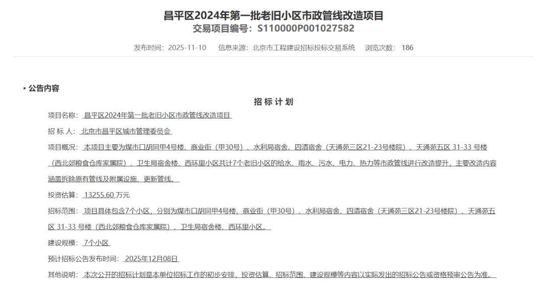 据公告显示,本项目主要覆盖煤市口胡同甲4号楼、商业街(甲30号)、水利局宿舍、四清宿舍(天通苑三区21-23号楼院)、天通苑五区 31-33 号楼(西北郊粮食仓库家属院)、卫生局宿舍楼、西环里小区共计7个老旧小区。