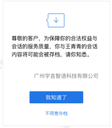 b.用户端:当用户接收到来自企微的消息时会有一则关于会话存档的提醒,客户可以根据自己的需求,选择是否同意存档,如果拒绝,则不会被存档。