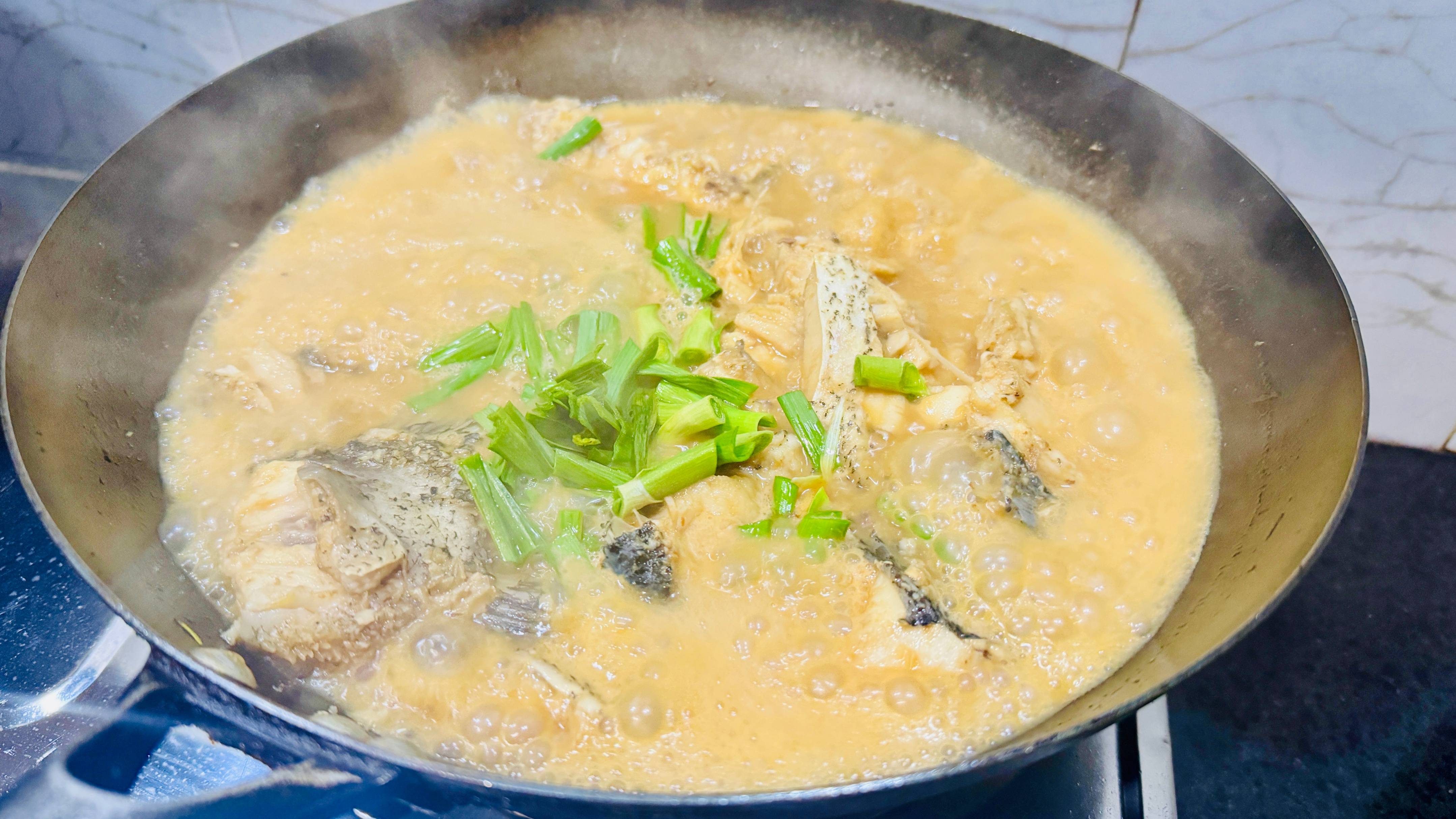 千滚豆腐,万滚鱼,加入开水之后让鱼块多炖一会,放些大蒜叶,炖入味,真的很香了,买的鱼尾太大了,不敢买蘑菇和千张了,要不这些都挺好吃的。