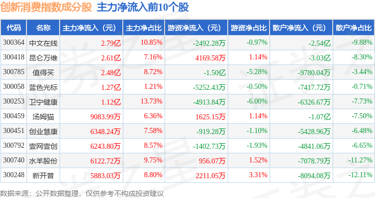 资金流向方面,创新消费(970041)指数成份股当日主力资金净流入合计13.91亿元,游资资金净流入合计4964.58万元,散户资金净流出合计14.4亿元。成份股资金流向详情见下表: