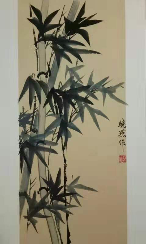 几竿竹子挺拔向上,竹叶以浓淡墨色写意勾勒,层次分明、疏密有致,展现出竹子的劲节与清雅之态。右侧的题款 “晓燕作” 及红色印章,体现了传统书画的形制规范。