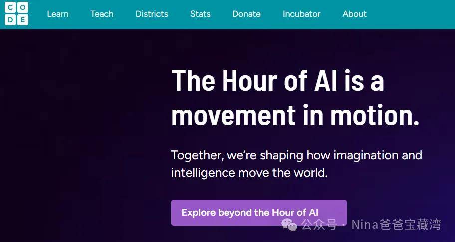 那对于普通家庭怎么搞?难道放弃AI?想要低成本,最好是全免费的学习AI内容有没有?当然是有的,今天nina爸爸来分享一个教育编程机构不想让你知道的网站,名字就叫CODE,这是一个面向全球青少年开放的公益计算机学习平台,所有课程资源均可免费获取,更重要的是网站自带中文翻译,方便青少年学习,不想了解的可以直接下拉到文末有一键直达。