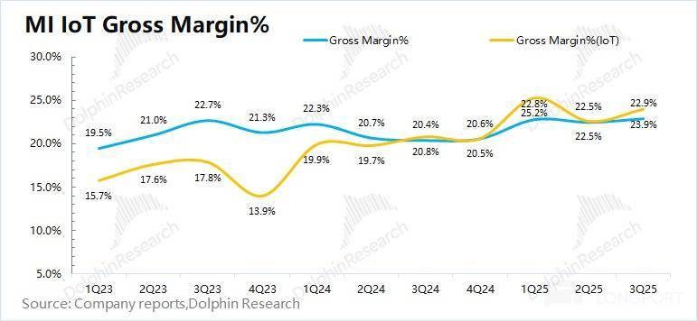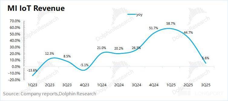 2025 年第三季度小米 IoT 业务实现营收 276 亿元,同比增长 5.6%。受国补退坡的影响,IoT 业务中的大家电品类出现两位数的下滑,直接影响了 IoT 业务的增速表现。