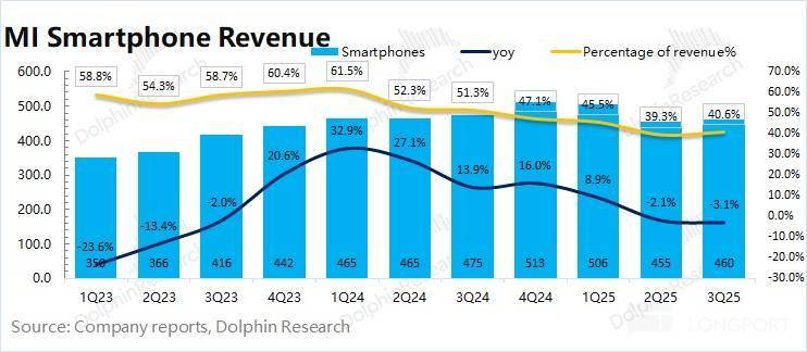2025 年第三季度小米智能手机业务实现营收 460 亿元,同比下滑 3.1%,主要受国补收紧和竞争加剧的影响。