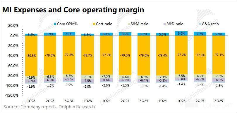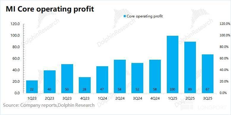 本季度汽车业务毛利率继续提升至 25.5%,市场预期(25.6%)。受 YU7 量产及规模效应的带动下,公司毛利率仍呈现上升的趋势。环比上季度的下滑,主要是高毛利率的 SU7 Ultra 占比减少。海豚君测算本季度小米汽车业务核心经营利润为 6.8 亿元(财报中披露的 11 亿,剔除了 4 亿元的股权激励相关费用),首次实现盈利。