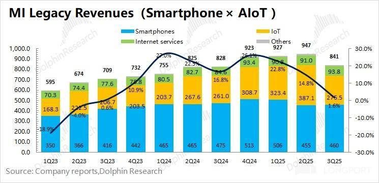1)原本的业务——手机 X AIoT 业务(传统业务)实现营收 841 亿元,同比增长 1.6%。其中硬件业务表现较弱,手机业务同比继续下滑,IoT 业务增速回落至个位数;