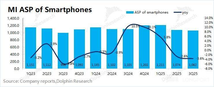 分市场来看:①国内市场,在国补收紧的情况下,小米手机在国内市场份额同比下滑至 14.6%,受市场竞争加剧的影响;②海外市场,小米手机同比增长 2.7%,海外市场份额同比持平。