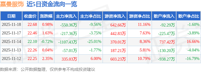 证券之星消息,截至2025年11月18日收盘,嘉曼服饰(301276)报收于22.68元,上涨0.98%,换手率5.53%,成交量2.55万手,成交额5756.4万元。