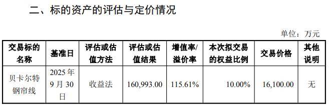 草案显示,本次交易的评估基准日为2025年9月30日。本次交易中,标的资产的交易价格根据符合《证券法》规定的评估机构出具的评估结果为基础,经交易双方协商确定。评估机构采用市场法及收益法对贝卡尔特钢帘线截至评估基准日2025年9月30日的全部股东权益进行了评估。根据北方亚事评估师出具的《资产评估报告》,截至评估基准日2025年9月30日,贝卡尔特钢帘线全部股东权益价值评估值为160,993.00万元,溢价115.61%。交易双方以评估结论为基础,经友好协商,确定本次交易标的资产(标的公司10%的股权)交易价格为16,100万元。