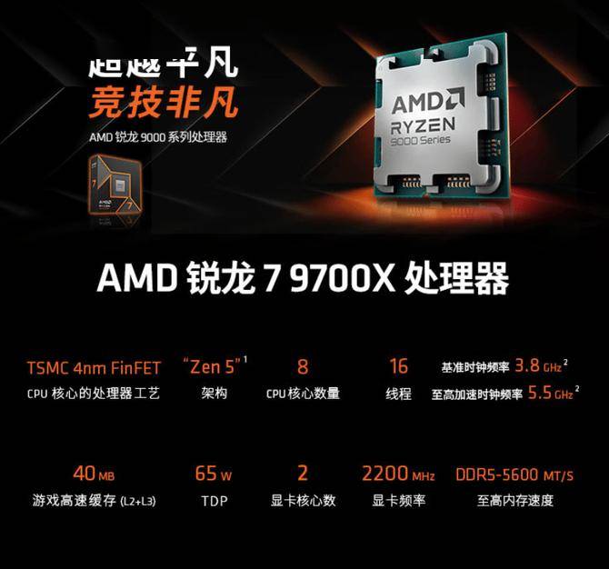 AMD 锐龙7 9700X处理器采用了TSMC 4nm FinFET工艺制程的ZEN5架构,搭配8核心16线程的配置和高达5.5GHz的最高频率,总计40MB的游戏缓存和65W的功耗设计非常适合主流玩家使用。目前攒机市场上,“5”力全开(ZEN5+DDR5+PCIe 5.0)组成的AM5平台成为了主流,AM5平台的长期支持与生态兼容性都让DIY玩家们更安心,而DDR4平台在技术上的局限性已经限制了飞速增长的性能需求,所以现在AMD锐龙处理器更受到DIY玩家们的青睐,而且AMD承诺这一代至少可以用到2027年+,大家放心“战未来”!