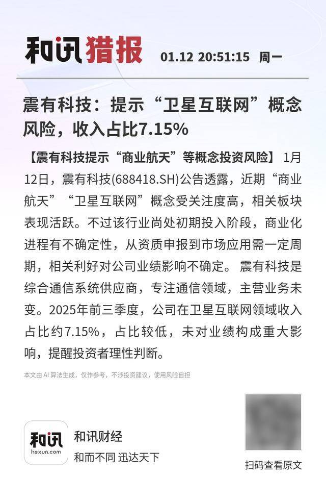 【震有科技提示“商业航天”等概念投资风险】1月12日,震有科技(688418.SH)公告透露,近期“商业航天”“卫星互联网”概念受关注度高,相关板块表现活跃。不过该行业尚处初期投入阶段,商业化进程有不确定性,从资质申报到市场应用需一定周期,相关利好对公司业绩影响不确定。 震有科技是综合通信系统供应商,专注通信领域,主营业务未变。2025年前三季度,公司在卫星互联网领域收入占比约7.15%,占比较低,未对业绩构成重大影响,提醒投资者理性判断。