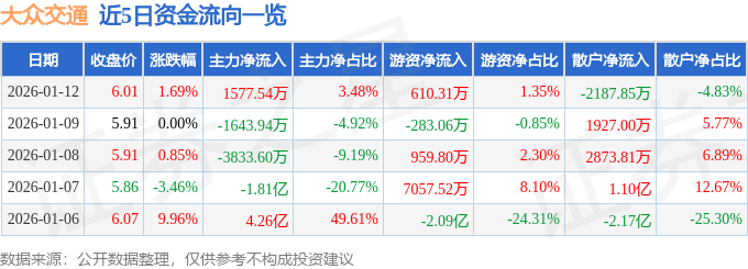 证券之星消息,截至2026年1月12日收盘,大众交通(600611)报收于6.01元,上涨1.69%,换手率4.85%,成交量75.84万手,成交额4.53亿元。