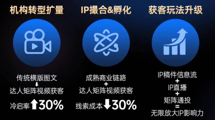 创课项目通过将传统机构从“传统横版图文”向“UP主矩阵视频获客”进行升级,可使冷启动成功率提升30%,同时线索成本降低30%;在获客玩法升级中通过IP稿件、IP直播、矩阵账号等组合方式,更能帮助机构放大影响力,实现用户触达的规模化。