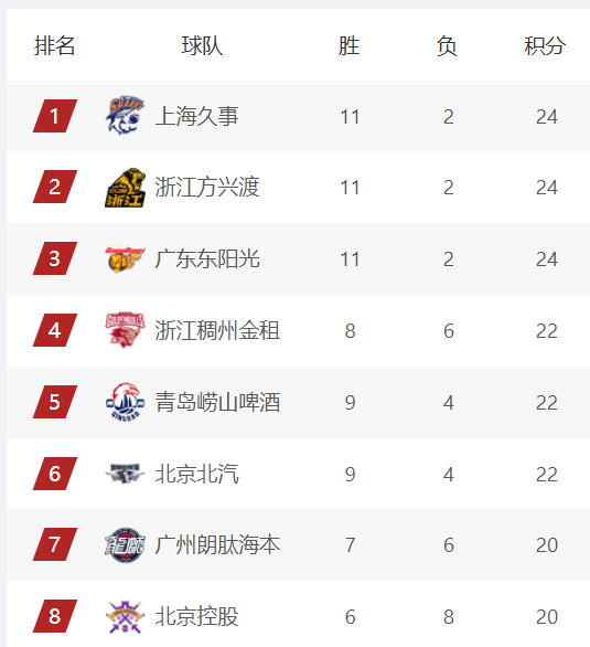 积分榜第5名则是青岛队,截止到目前,青岛队的战绩开始回落,以9胜4负的战绩,排在积分榜第五名。而作为争冠第一大热门球队,北京队最近状态欠佳,遭遇一波两连败后,北京队已经被上海、广厦以及广东拉开差距,球队目前的战绩是9胜4负,暂居积分榜第6名。而排在积分榜第7名的是广州队,他们在这一轮比赛爆冷输给了天津队,目前球队的战绩是7胜6负。积分榜第8则是北控队。