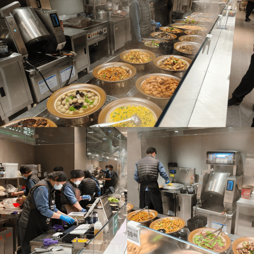 新增的现炒菜档口则提供丰富菜品选择,价格分为三档:19.8元/500g、39.8元/500g、59.8元/500g,由炒菜机器人与工作人员现场炒制出锅,兼顾效率与新鲜。