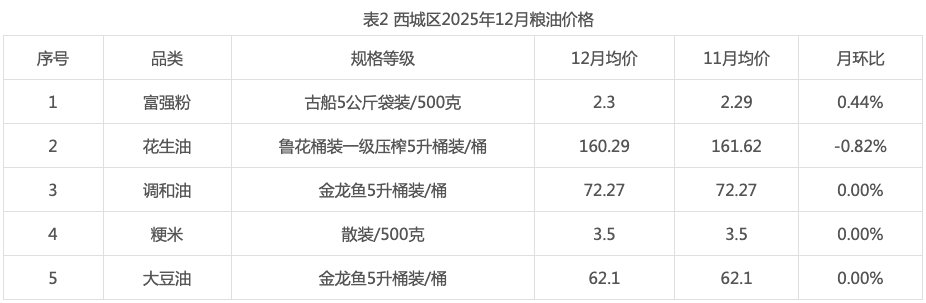 根据12月份粮油价格监测数据,主要品类价格总体平稳,部分品种略有波动。富强粉均价为2.3元/500克、粳米均价3.5元/500克、大豆油价格为62.1元/桶、花生油160.29元/桶、调和油72.27元/桶。整体来看,西城区12月粮油价格基本稳定。