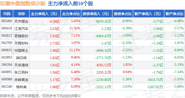 资金流向方面,巨潮中盘(399315)指数成份股当日主力资金净流出合计76.25亿元,游资资金净流入合计8.56亿元,散户资金净流入合计67.69亿元。成份股资金流向详情见下表: