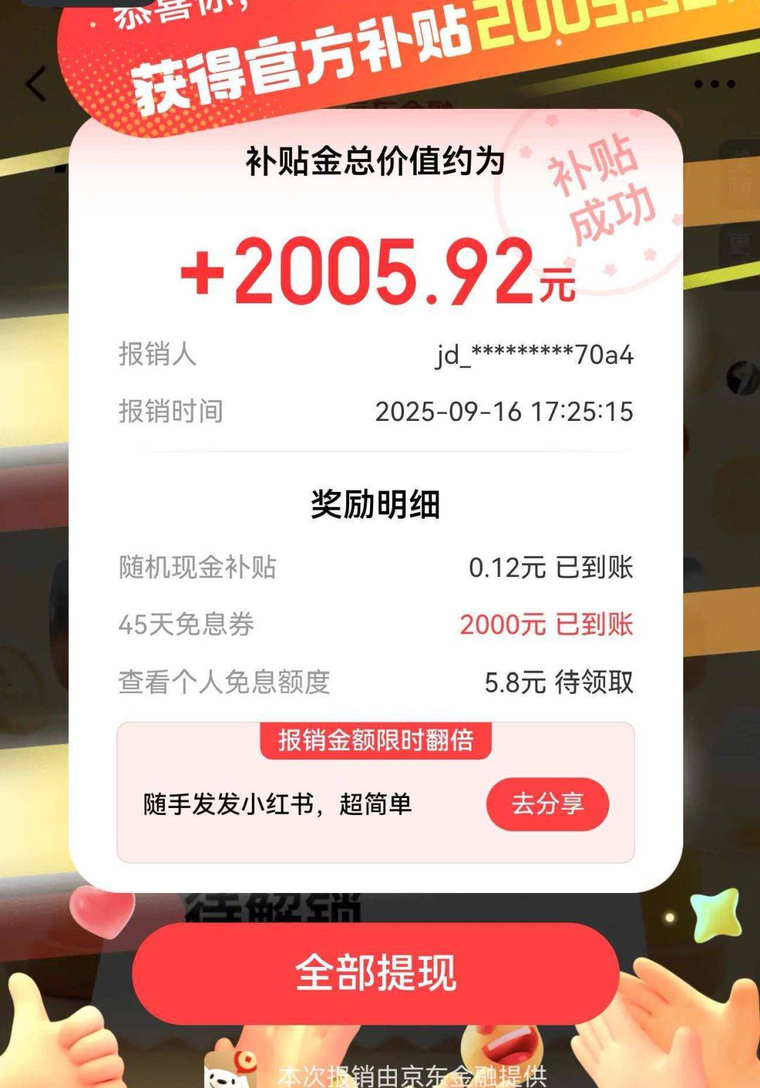 现金补贴直接发放至钱包余额,免息券为利息最高减2000元,由京东金条提供服务。