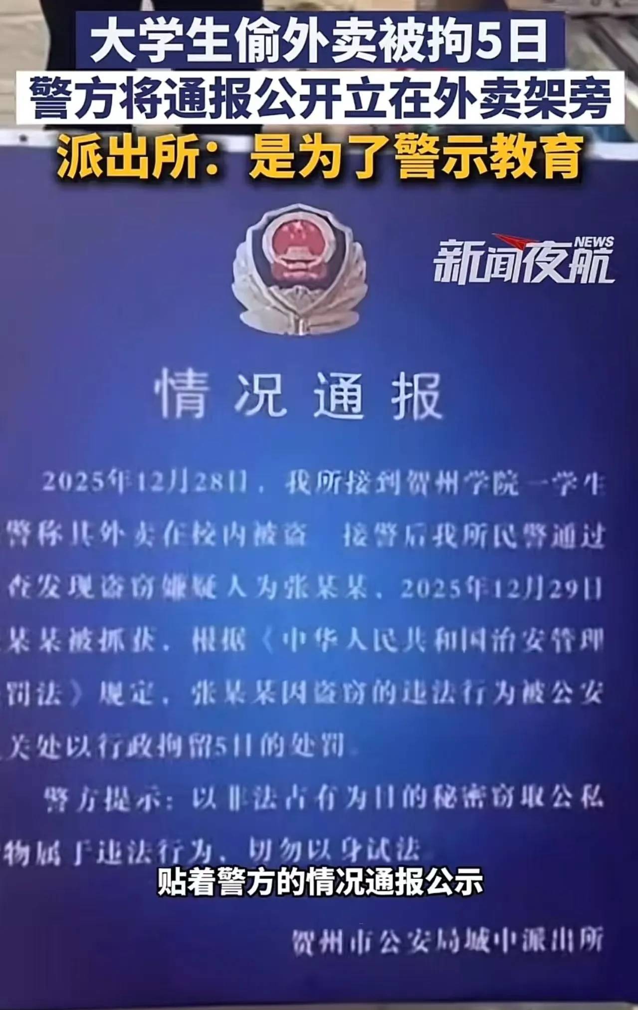 三、争议核心:是“震慑犯罪”还是“毁掉一生”?规则和温度该怎么选 法律层面说清楚了,但网友的争议核心其实是:这种“挂牌通报”的方式,到底合适吗? 支持方认为:学校长期被外卖失窃困扰,公开通报能起到“杀一儆百”的效果,让其他人不敢再偷,维护大家的财产安全。成年人要为自己的行为负责,既然敢偷,就该承受后果,这不是“毁一生”,而是让他记住教训,以后不再犯更大的错。 反对方则觉得:就算是违法,也得先搞清楚原因啊!如果学生真的是家境贫寒,饿到没办法才偷外卖,公开通报就是“社会性处死”——让他在同学面前抬不起头,自尊心受重创,以后可能破罐子破摔,真的毁掉一生。学校和警方的责任是教育人、帮助人,而不是把人钉在“耻辱柱”上。 我觉得,这事的关键不在于“要不要处罚”,而在于“怎么处罚才合理”。 首先,处罚是必须的!成年人要为行为负责,这是底线。偷外卖看似事小,但侵犯了别人的财产权,多次盗窃更是挑战规则,不处罚就是纵容,对那些遵纪守法的学生不公平。行政拘留5日的处罚,合法合规,也能起到警示作用。 但其次,“挂牌通报”的方式真的有待商榷。教育的本质是“治病救人”,不是“羞辱示众”。警方和校方的初衷是遏制盗窃,但有没有考虑过学生的处境?就算这学生是贪小便宜,公开通报也可能让他被孤立、被网暴;如果真的是家境困难,这种做法更是雪上加霜,违背了教育的温度。 其实完全有更好的办法:私下里对学生进行批评教育,让他赔偿失主损失,写保证书;如果是家境贫寒,学校可以启动帮扶机制,比如提供助学金、勤工俭学岗位,从根源上解决问题。而不是用“公开通报”这种简单粗暴的方式,把人推向对立面。 真正的法治精神,不是“一罚了之”,而是在维护规则的同时,给人改过自新的机会;真正的教育,也不是“挂牌示众”,而是在坚守底线的同时,保留一份人性的温度。