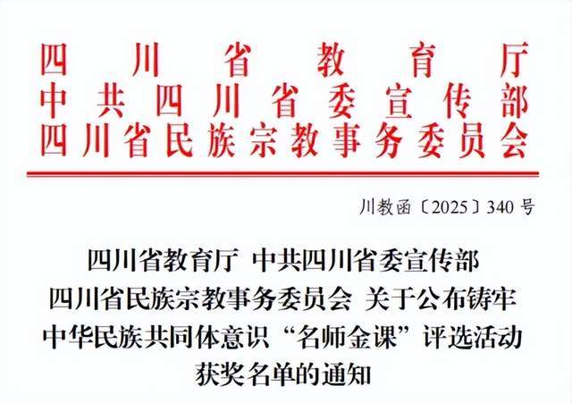 近日,由四川省教育厅、中共四川省委宣传部、四川省民族宗教事务委员会联合主办的四川省首届铸牢中华民族共同体意识教育“名师金课”评选活动结果正式揭晓。