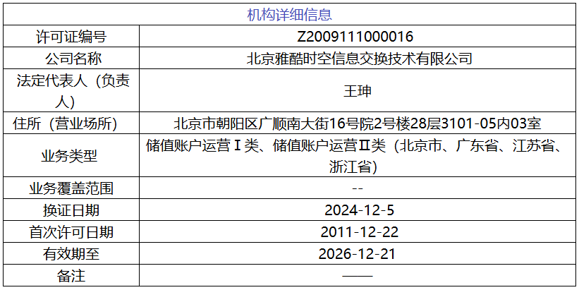 中国人民银行北京市分行非银行支付机构重大事项变更许可信息公示(2025年11月14日)显示,同意北京雅酷时空信息交换技术有限公司变更公司名称为北京酷宝支付科技有限公司。