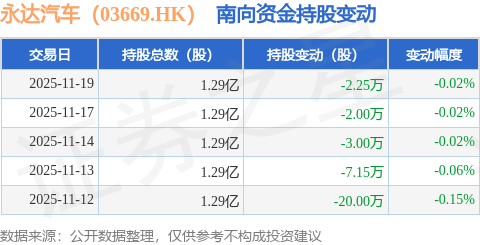 证券之星消息,11月19日南向资金减持2.25万股永达汽车(03669.HK)。近5个交易日中,获南向资金减持的有5天,累计净减持34.4万股。近20个交易日中,获南向资金减持的有20天,累计净减持326.65万股。截至目前,南向资金持有永达汽车(03669.HK)1.29亿股,占公司已发行普通股的6.93%。