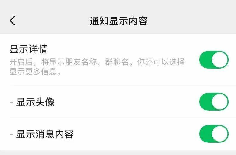 这也是最近一段时间一直在灰度内测的一个功能,与老版本相比,在进入微信后依次打开【设置-通知-通知显示内容】页面,可以看到这个页面变成了“显示详情”,打开这个开关之后,可以单独设置显示头像和显示消息内容的2个模块。