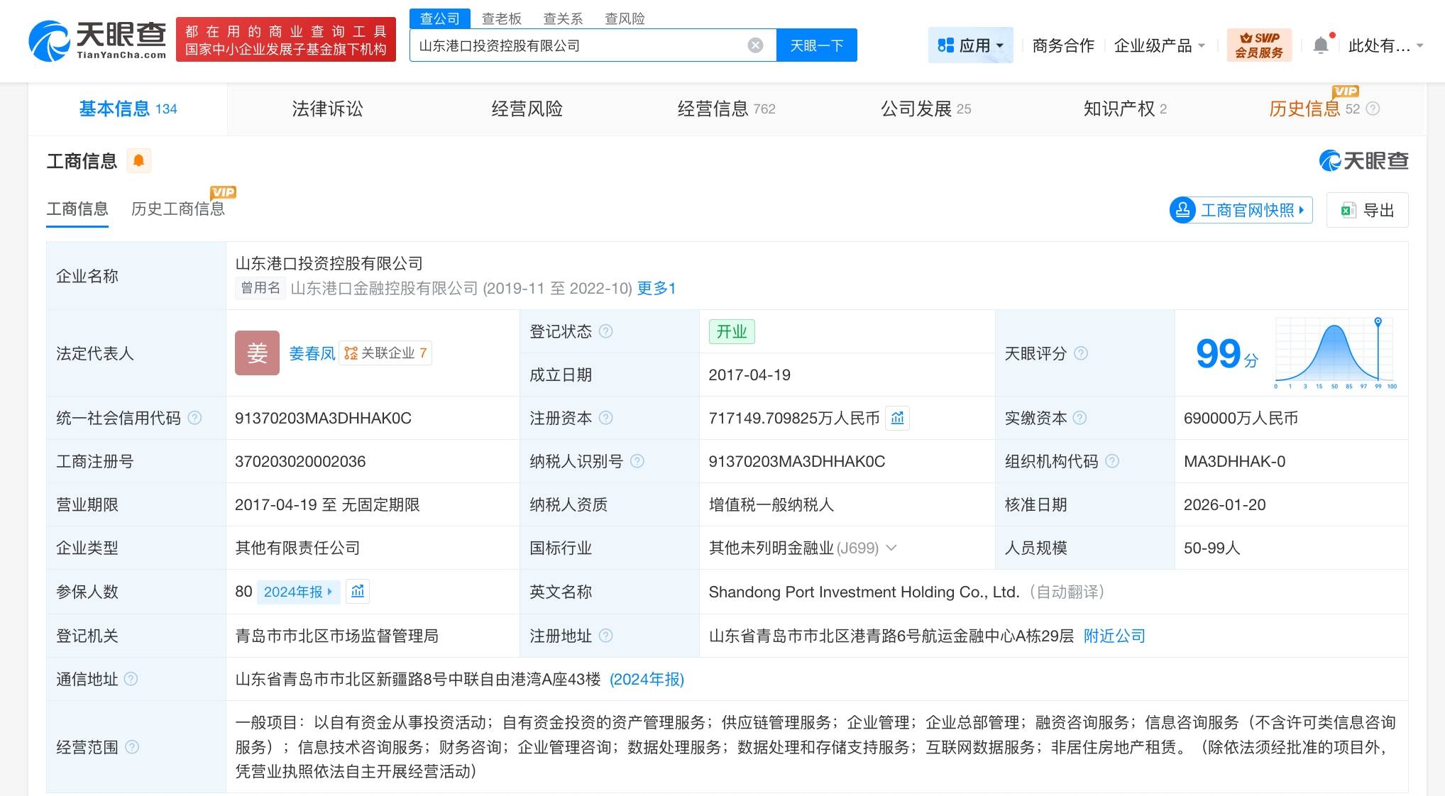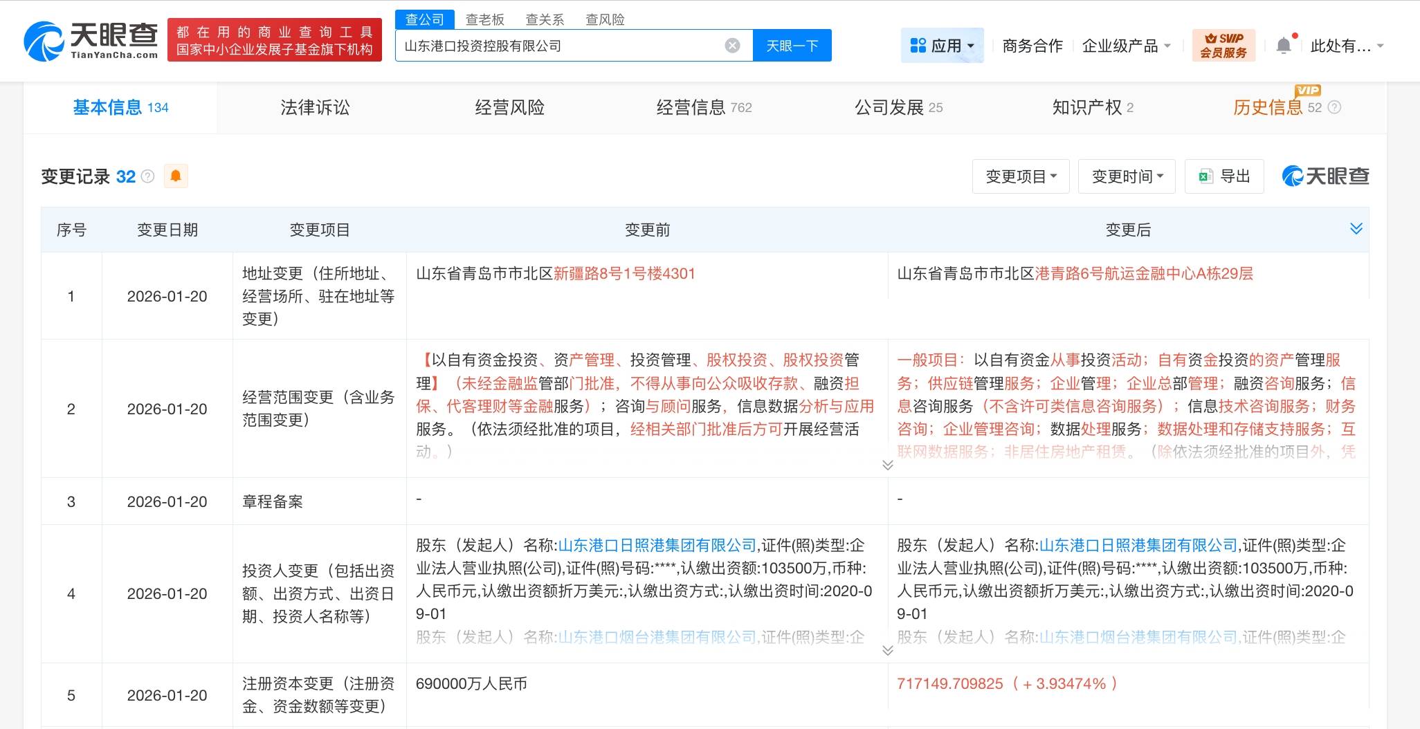 天眼查工商信息显示,近日,山东港口投资控股有限公司发生工商变更,注册资本由69亿人民币增至约71.7亿人民币,增幅约4%。