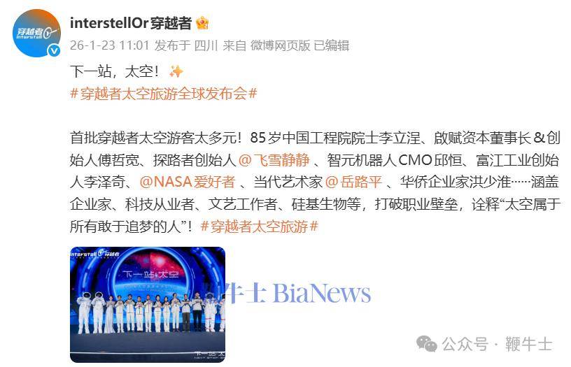 截至目前,穿越者已预订超三艘船,签约来自学界、商界、航天界、艺术界、娱乐界等领域太空游客,其中还包括众擎机器人。