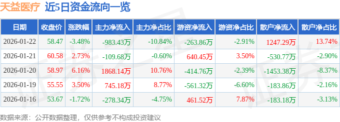 证券之星消息,截至2026年1月22日收盘,天益医疗(301097)报收于58.47元,下跌3.48%,换手率5.33%,成交量1.54万手,成交额9074.82万元。