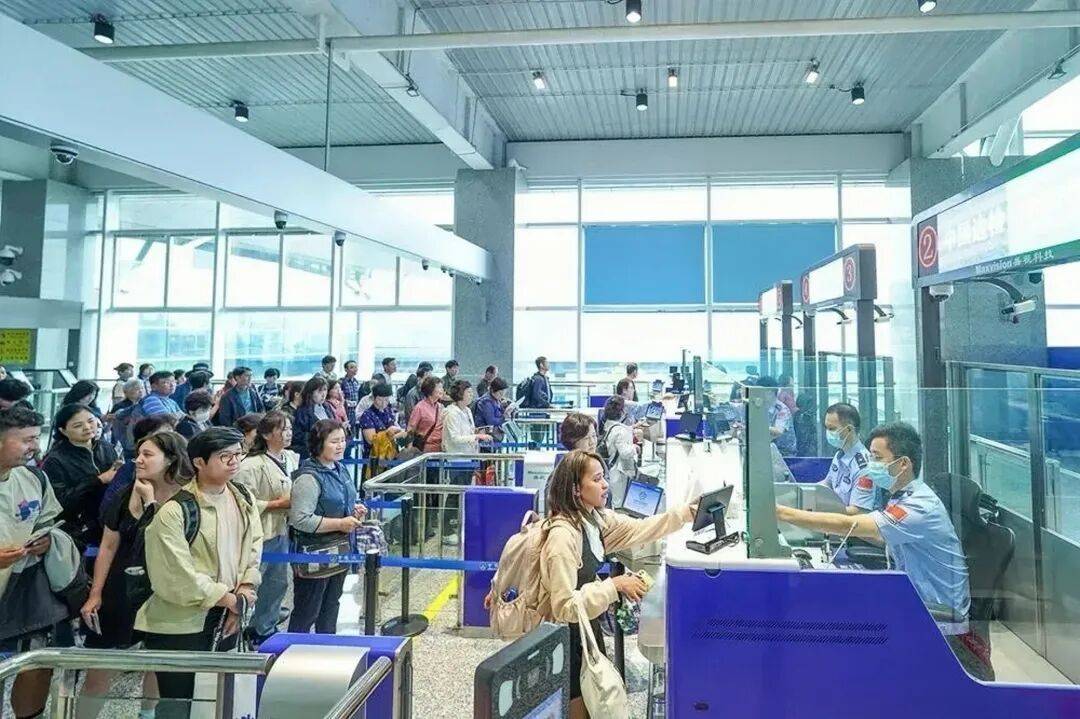 外国入境游客在张家界空港口岸有序办理通关手续。