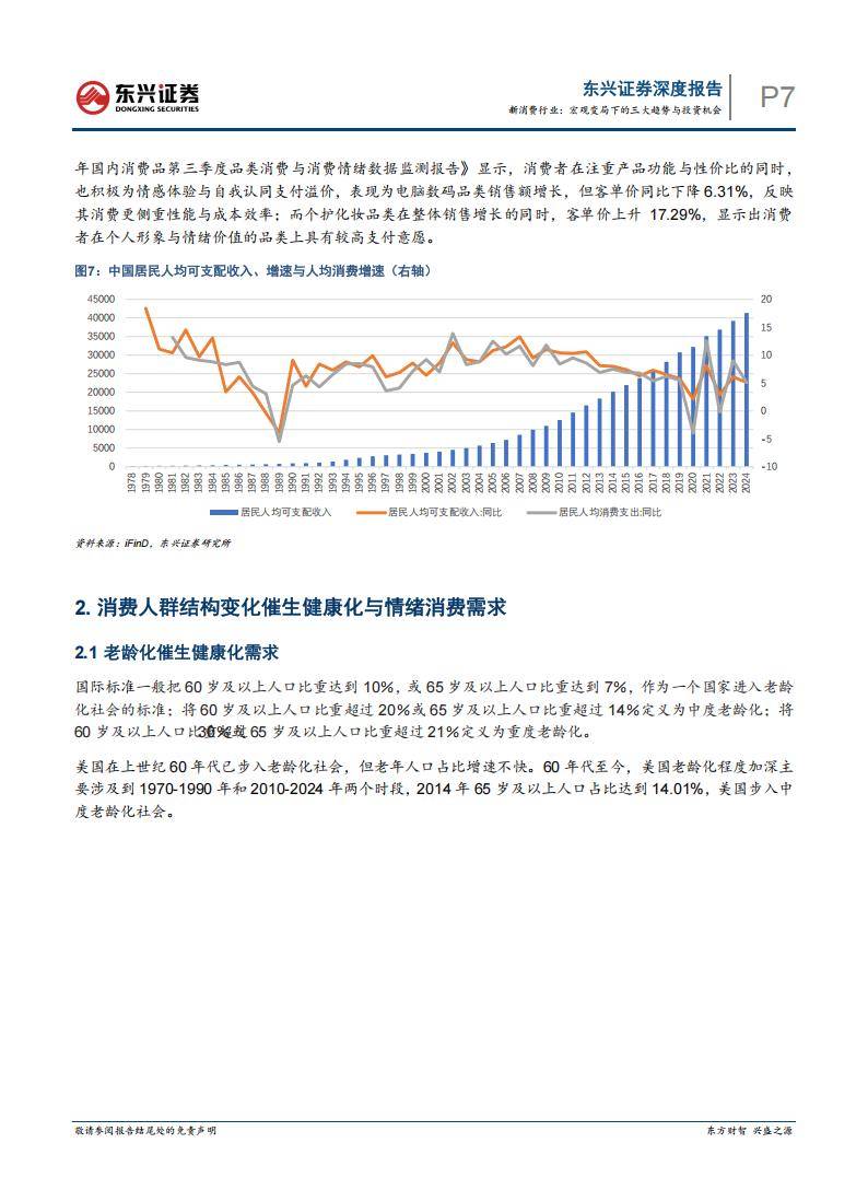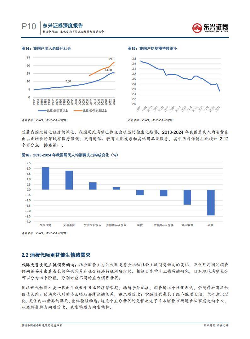 我国人口结构持续老龄化,家庭户均规模不断缩小。国际通行标准下,中国2020年迈入中度老龄化社会,卫健委预计2035年进入重度老龄化。2024年,60岁及以上人口和65岁及以上人口分别占比14.2%和21.1%,其中“新老人”群体规模逐年扩大。这一变化直接带来消费结构的深度调整。