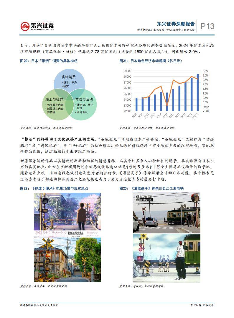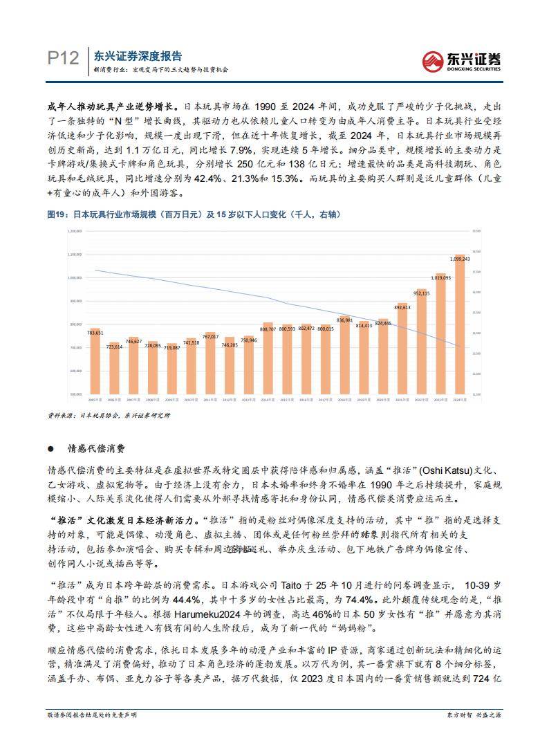 日本“治愈系”消费爆发,宠物经济市场规模2025年预计突破1.9万亿日元。玩具行业也出现逆势增长,2024年市场规模创新高,成年人推动的卡牌、潮玩成为新亮点。情感代偿类消费快速扩容,“推活”文化带动动漫、偶像、游戏等角色经济发展,2024年角色经济市场规模2.78万亿日元。