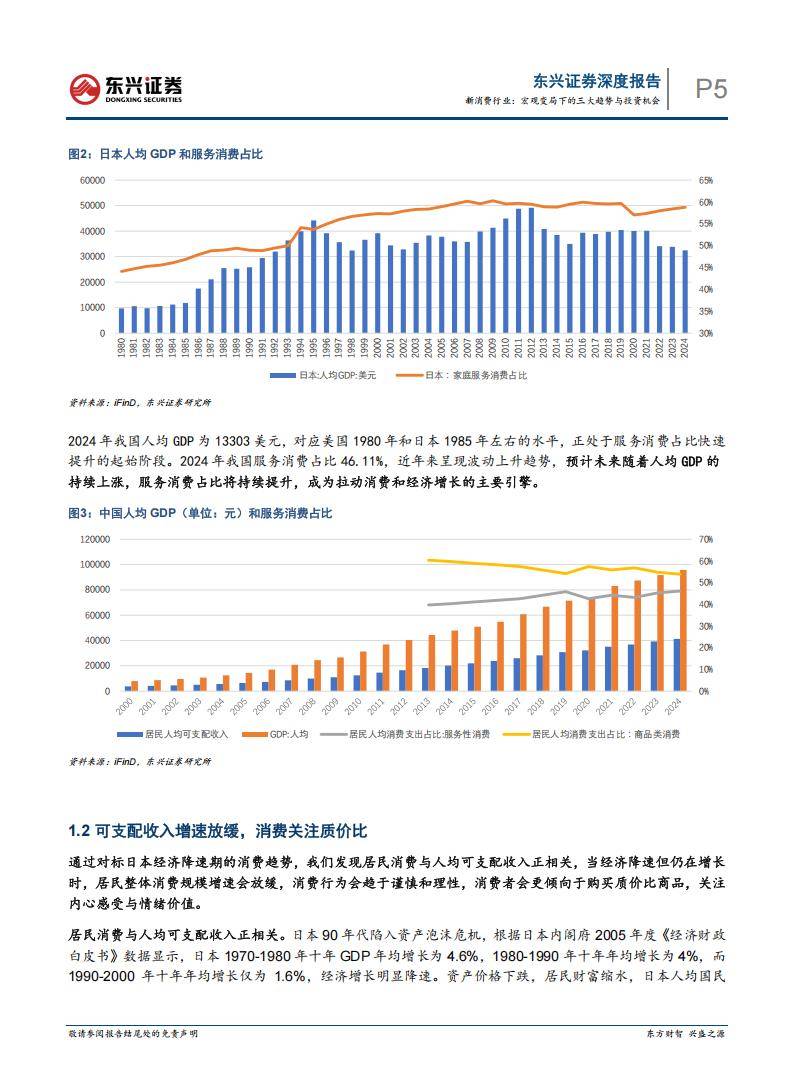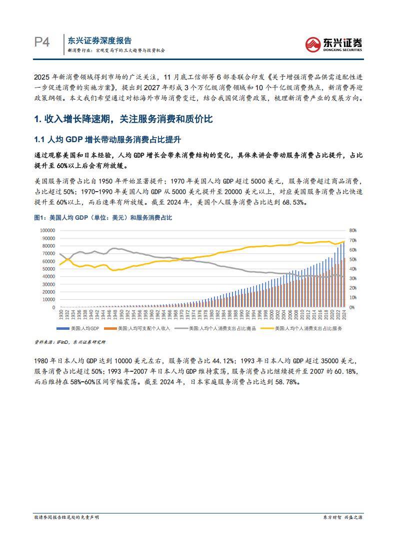 对比美国和日本的发展轨迹,人均GDP的提升将直接带动服务消费占比走高。以美国为例,1970年人均GDP超过5000美元,服务类消费首次反超商品类;到2024年服务消费占比已接近七成。日本1980年人均GDP1万美元,服务消费占比44%,到2024年提升至近59%。中国2024年人均GDP为13303美元,服务消费占比46.11%,正处于服务消费加速提升期,预计未来几年服务消费将成为主要增长引擎。