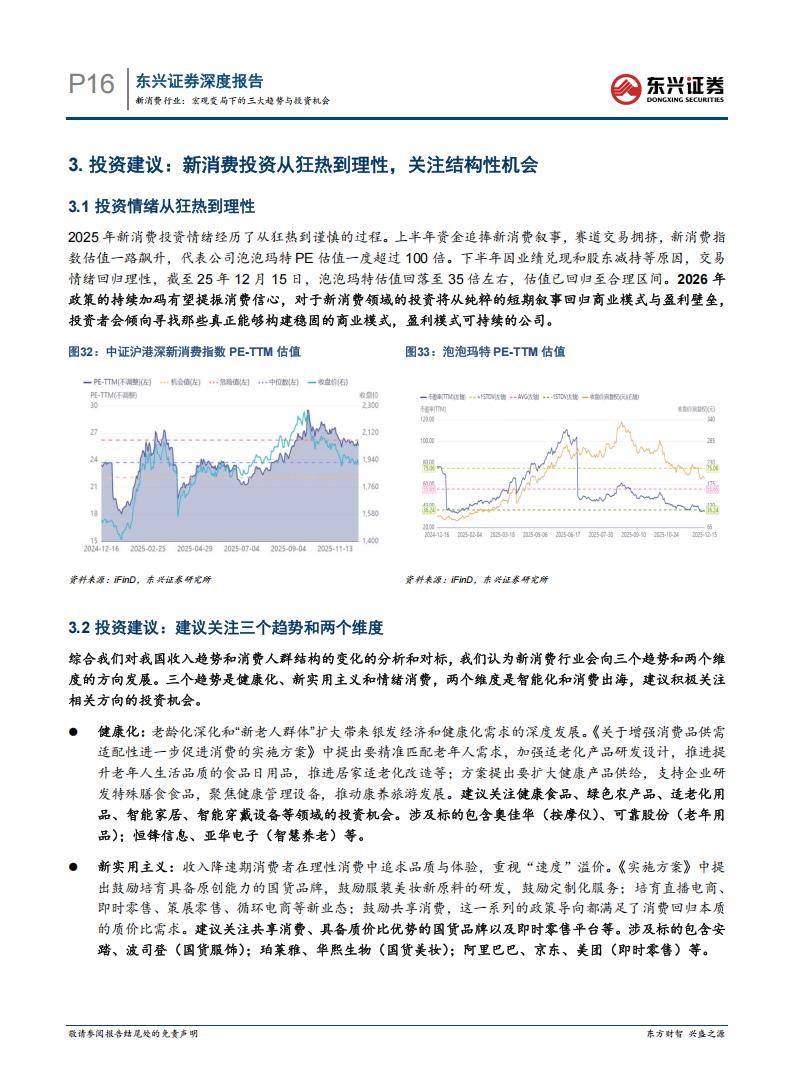 2025年上半年新消费投资情绪高涨,泡泡玛特等新消费公司估值冲高,下半年回归理性,投资更看重商业模式和持续盈利能力。2026年政策加码预期下,市场重回理性,投资主线从短期叙事切换至长期壁垒。