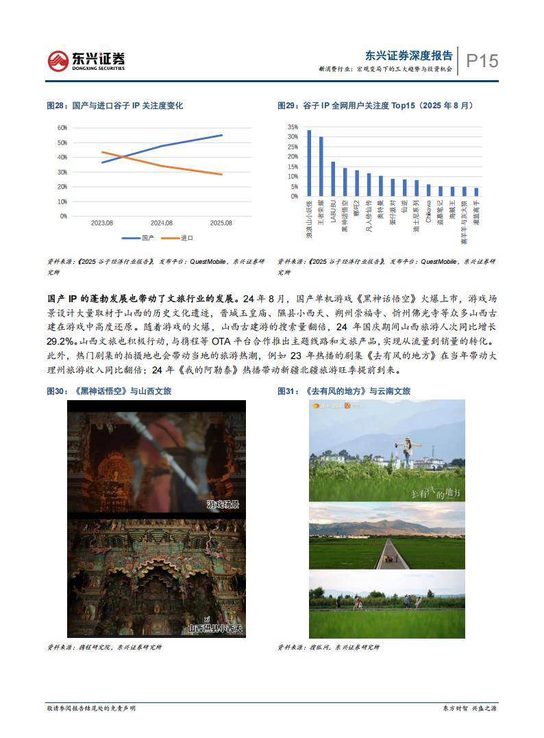 国内同样如此,X世代(40-59岁)是目前消费主体,Y世代、Z世代加速上位,消费风格由谨慎务实转向个性化、情绪和兴趣消费。QuestMobile数据显示,2025年“谷子经济”市场规模预计突破2400亿元,“泛二次元”活跃用户超3.5亿,核心用户超9000万,30岁以下用户占比近一半。国产IP快速崛起,带动文旅产业联动爆发。比如2024年《黑神话悟空》游戏火爆上市,拉动山西文旅热度,国庆期间旅游人次同比增长29.2%;影视剧同样推动大理、新疆等地旅游消费翻倍增长。